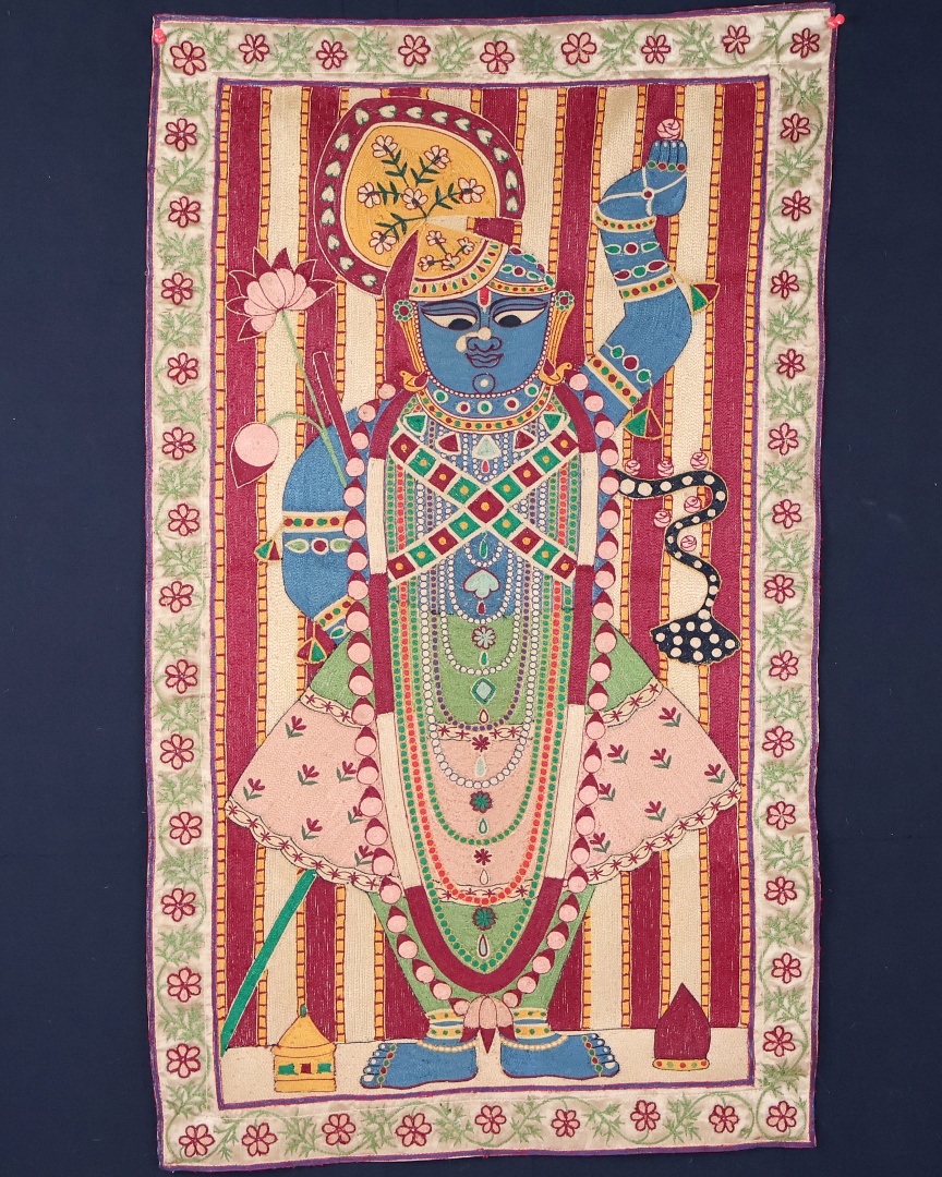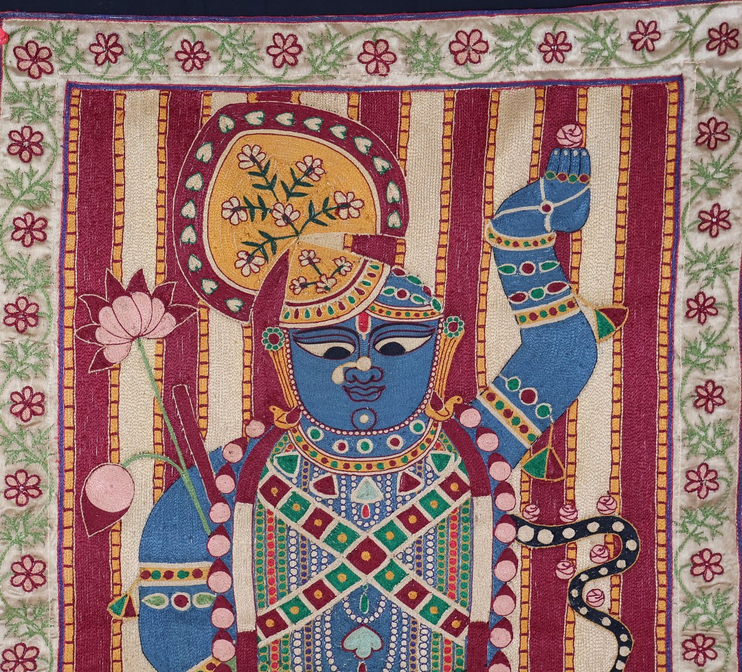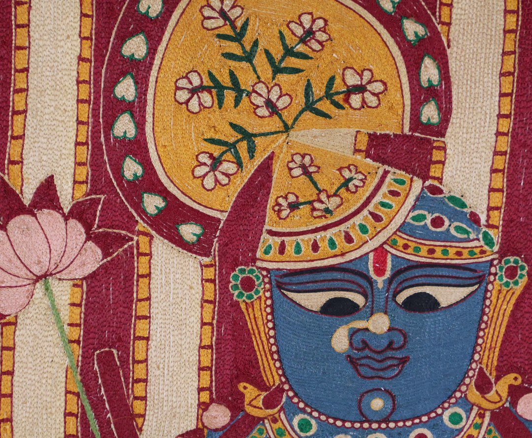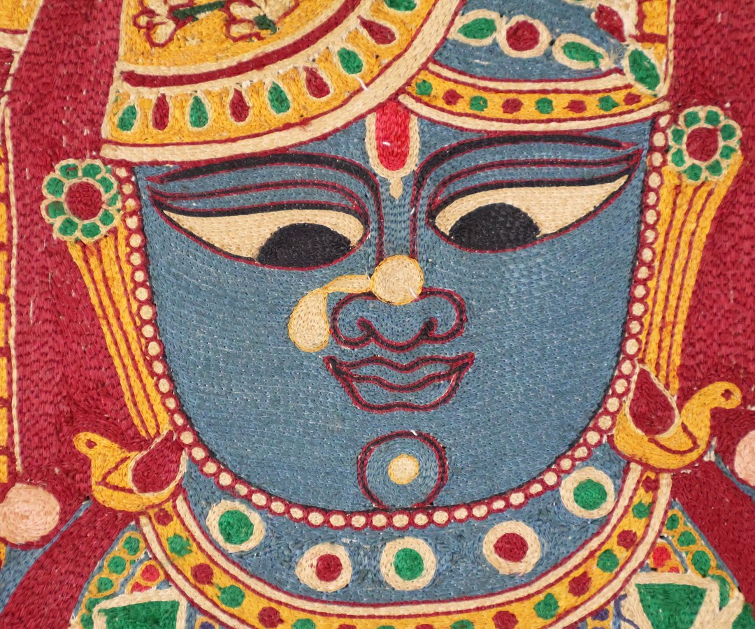 Vintage fun, Krishna embroidered on silk adras ground.