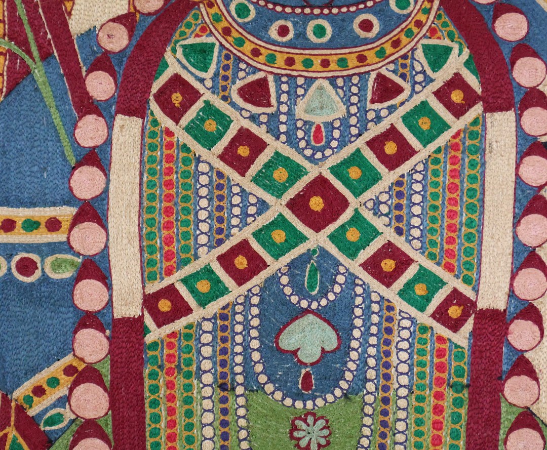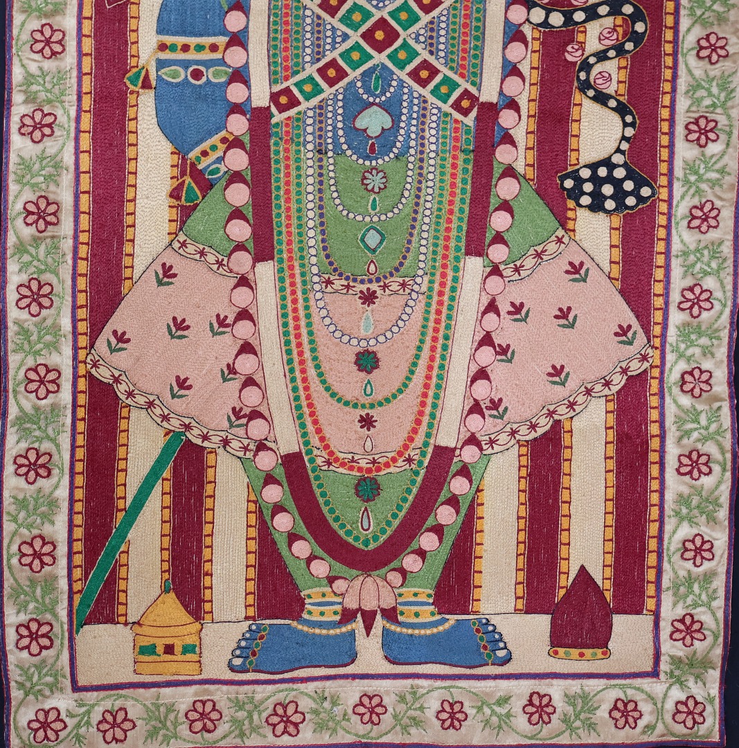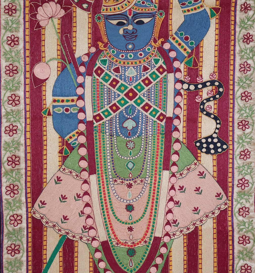 Vintage fun, Krishna embroidered on silk adras ground.