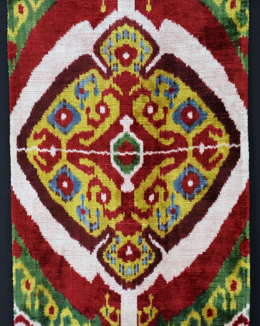 - A double‑cloth woven velvet in which the warp threads are resist‑dyed before weaving, creating the characteristic ikat “feathered” motifs.